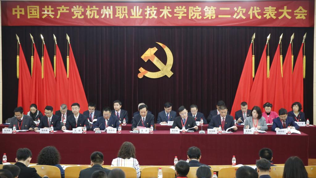 庄严的报告厅气氛热烈,主席台上方悬挂着“中国共产党杭州职业技术学院第二次代表大会”的横幅,背景正中镰刀和锤头组成的党徽熠熠生辉,10面红旗分列两侧鲜艳似火。报告厅后面悬挂的“勇担使命,砥砺奋进,为建设国内一流,国际上有较大影响力的‘高职名校’不懈奋斗!”的横幅分外醒目。